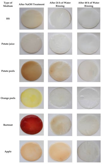 In order to assess the potential advantage of PJ over the other natural ingredient-based media, we prepared media from other food/agro-industry waste (potato peels, orange peels, beetroots, and apples) in the same fashion as the PJ media. We noted that, in terms of transparency, the PJ medium was comparable to the HS medium (Supplementary Figure S1). Further, for the case of PJ, there were fewer solids that had to be removed prior to the BC production. As was anticipated, the colors of the media prepared from the beetroots, apples, and even potato peels were also reflected in the pigmentation of the BC pellicles (Figure 5). This necessitated a longer purification process, as compared with the BC obtained from cultures in PJ or HS media (Figure 6). In the case of the BC obtained from an orange-peel-based medium, the yellow pigment was removed in the first stage of purification. However, in this case, the relative ease of pigment removal was likely due to the reduced thickness of the obtained cellulose membrane and its amorphous structure, which lowers its potential industrial applicability. In the case of other fruit-based media, some residues of the fruits were tightly bound to the BC and remained, even after the purification process (Figure 7). In contrast, none of these issues were observed when the PJ medium was used for BC synthesis.