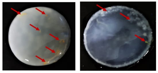 Purified BC from K. xylinus ATCC 53524 synthesized using natural (fruit) ingredients-based media. Red arrows indicate residues fragments (hard-to-remove impurities) of fruits bound in the BC membrane.