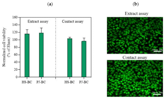 (a) L929 fibroblast viability data, as a percentage of the sham; (b) fluorescence live/dead visualization of L929 fibroblasts exposed PJ-BC for 24 h (extract and direct contact) and stained with Syto 9 (green, live) and propidium iodide dyes (red, dead). Data are presented as mean ± standard error of the mean (SEM); HS-BC—BC biosynthesized in HS medium; PJ-BC—BC biosynthesized in PJ medium.