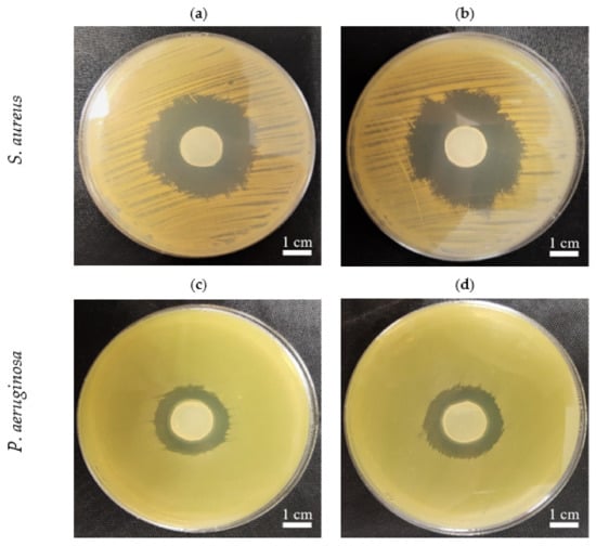 The growth inhibition zones in S. aureus (ATCC 6538) and P. aeruginosa (ATCC 15442) cultures, incubated with BC samples from K. xylinus ATCC 53524 soaked with an octenidine-containing antiseptic: (a,c) HS-BC; (b,d) PJ-BC. The comparable sizes of growth inhibition zones are seen with regard to specific pathogens independently from the type (PJ, HS-BC) of cellulose in which the sorption of octenidine was performed.