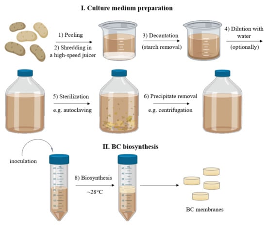 With these aspects in mind, we turned our attention to the potato industry. Potatoes are vegetables with high nutritional value and their extensive cultivation in Eastern Europe, China, and India translates into high availability and low price throughout the year cycle [17]. At the same time, the potato agro-industry generates substantial waste. Recently, Abdelraof et al. described their efforts to utilize potato peel waste for obtaining substrates for BC biosynthetic media [18]. To our knowledge, this is the only report concerning the use of potatoes or potato waste to produce BC. However, the processing of potato peels in order to obtain sufficient sugar content also required the use of acidic hydrolysis, with additional reagents, and high energy consumption (the hydrolysis process was carried out at a temperature of 100 °C). As a result, the potential industrial applicability and cost-effectiveness of this approach are limited.
