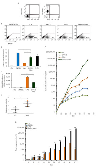 During cell culture expansion, the number of ZNF521-overexpressing cells significantly increased compared to the control; however, these cells did not immortalize and had a limited life span, and after 56 days, they ceased to grow (Figure 2F). Instead, enforced expression of the MLL-AF9 fusion protein was able to immortalize the human CB-CD34+ cells, conferring a strong proliferative advantage; in particular, MLL-AF9 expressing cells steadily increased in number beginning from the second week. Something noteworthy is that double transduction with ZNF521 and MLL-AF9 transgenes led to a further increase in the cumulative number of cells (382× more than MA9 alone); the transformed cell populations reproducibly continued to grow after 2 months in liquid cultures (Figure 2F).