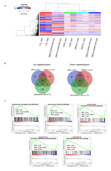 Gene expression analysis was performed with the ClariomD array. (A) Clustering on the top 1% (1358/135750) of transcripts with the highest variance across the entire dataset. Average clustering method was applied. Blue–red color scale was used to set rows with a mean of zero and a standard deviation of one. (B) Venn diagrams illustrating the significantly up- or down-regulated genes at FDR <10% by RankProduct analysis in ZNF521 and MA9 at 23 days or after their combination at 58 days compared to control cells. The corresponding transcript lists are reported in Supplementary File S2. (C) Selected significant Hallmark and Kegg pathways determined by GSEA analysis with corresponding normalized enrichment score (NES) and p-value parameters.