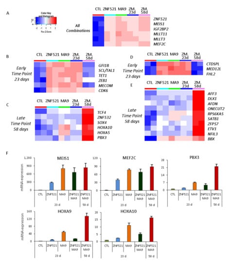 Heatmaps of selected transcripts from differentially expressed transcript lists at FDR < 10% of ZNF521, MA9, and ZNF521-MA9 (ZM) at 23 and 58 days compared to the control condition at 23 days. Known or other target genes that are up-regulated in all comparisons (A) at early (B,D) or late time points (C,E) are depicted. Blue–red color scale was used to set rows with a mean of zero and a standard deviation of one. (F) Confirmation of the array by Q-RT-PCR for MEIS1, MEF2C, HOXA10, HOXA9, and PBX3.