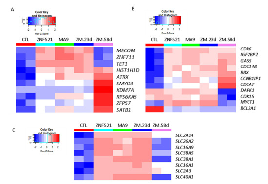 Heatmaps of selected differentially expressed transcripts in ZNF521, MA9, and ZNF521-MA9 (ZM) at 23 days and/or in ZNF521-MA9 (ZM) at 58 days compared to the control condition. (A) Genes involved in epigenetic functions. (B) Genes involved in cell cycle function. (C) Transporter genes. Blue–red color scale was used to set rows with a mean of zero and a standard deviation of one.