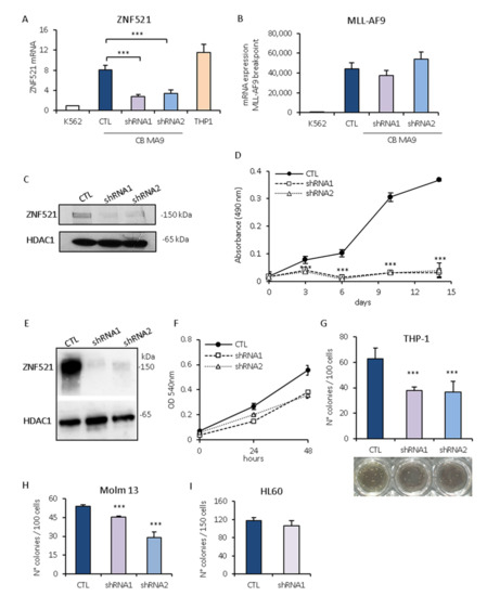 Additionally, we also used the THP-1 human leukemia cell line carrying an MLL-AF9 rearrangement and expressing high amounts of ZNF521. The silencing of ZNF521 (Figure 6E) induced a decrease in the growth rate compared to the control (Figure 6F) and was accompanied by a reduced clonogenic ability (about 50%) (Figure 6G). The results were confirmed in MOLM-13 cells, which also harbor an MLL-AF9 translocation, which were similarly affected by the silencing of ZNF521, as shown by reduced colony formation (Figure 6H); as a negative control, ZNF521-negative HL60 cells were used and displayed no significant change in colony formation upon ZNF521 knock-down (Figure 6I).