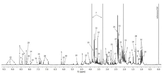 The representative 1D 1H NMR spectrum of intracellular metabolites of drug-susceptible Pseudomonas aeruginosa strain. (1—5-aminopentanoate, 2—acetate, 3—adenine, 4—alanine, 5—AMP, 6—aspartate, 7—betaine, 8—ethanol, 9—formate, 10—glucose, 11 -glutamate, 12—glycine, 13—histamine, 14—histidine, 15—homoserine, 16—isobutyrate, 17—isocitrate, 18—isoleucine, 19—lactate, 20—leucine, 21—methionine, 22—NAD+, 23—oxypurinol, 24—phenylalanine, 25—pyruvate, 26—sarcosine, 27—succinate, 28—threonine, 29—tyrosine, 30—UMP, 31—uracil, 32—valine).