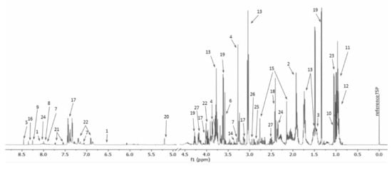 The representative 1D 1H NMR spectrum of extracellular metabolites of drug-susceptible Pseudomonas aeruginosa strain (1—6-hydroxynicotinate; 2—acetate; 3—alanine; 4—betaine; 5—formate; 6—glycine; 7—histamine; 8—histidine; 9—imidazole; 10—isobutyrate; 11—isoleucine; 12—leucine; 13—lysine; 14—methanol; 15—methionine; 16—oxypurinol; 17—phenylalanine; 18—pyruvate; 19—threonine; 20—trehalose; 21—tryptophan; 22—tyrosine; 23—valine; 24—glutamate; 25—aspartate; 26—asparagine; 27—pyroglutamate).