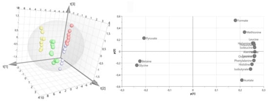 Supervised analysis OPLS-DA analysis provides the strain’s grouping. The CV-ANOVA test of this model gave statistically important results (model with parameters are available in Supplementary Materials (Figure S1)).
