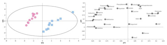PCA model plot and corresponding loading plot of 1H NMR data of intracellular metabolites of drug-resistant (blue squares) and drug-susceptible (red circle) P. aeruginosa strains. Symbols in the same color represent biological repetitions.