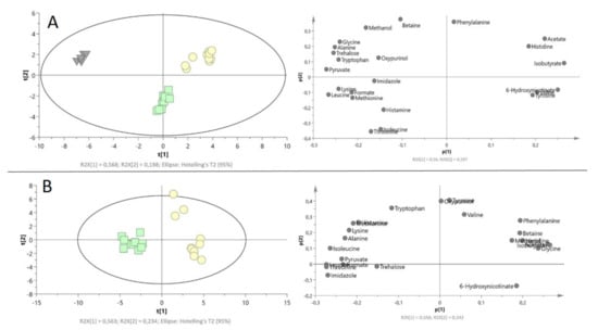 PCA model plots and corresponding loading plots for 1H NMR data of extracellular metabolites of P. aeruginosa strains. (A) Both P. aeruginosa strains with control; (B) both P. aeruginosa strains. Drug-resistant extracellular (green squares), drug-susceptible extracellular (yellow circle), control—LB medium (gray triangles). Symbols in the same color represent biological repetitions.