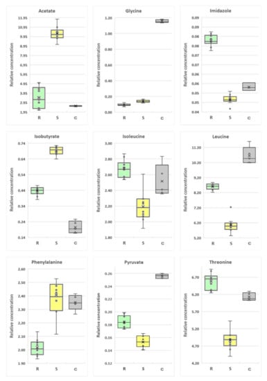 Boxplots for extracellular metabolites with VIP (Variable Importance in Projection) scores above 1.00 and statistically important after p-value adjustment (q < 0.05). Yellow bars—S—drug-susceptible strain. green bars—R—drug-resistant strain, gray bars—C—control (medium LB).