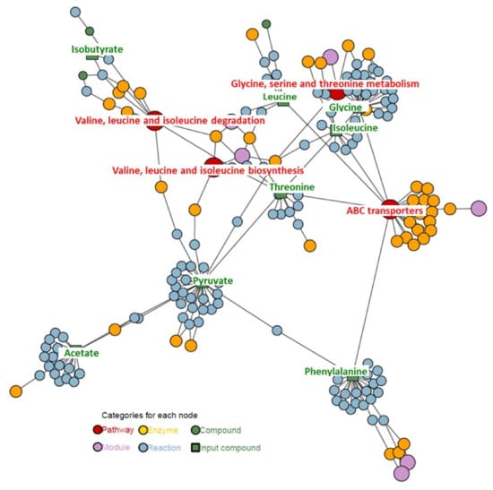 Bioinformatics analysis was used to produce a graphical representation of compounds, enzymes, reactions, modules, and pathways with information on how the input metabolites found in the statistical analysis reach the suggested pathways and on how these pathways cross-talk. An interactive version of the graphic for analysis is also available. For this analysis metabolites with statistical importance and VIPs greater than 1.00 were chosen.