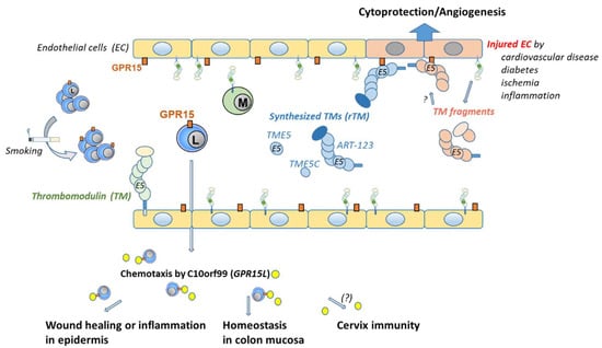 Apart from the rTM, heterogeneous soluble TM fragments from vascular endothelial cells circulate in the plasma and are found at increased levels in various diseases, such as cardiovascular disease and diabetes, and in ischemic and/or inflammatory endothelial injuries []. It has been shown that these soluble TM fragments retain significant anticoagulant activities. Since the fourth and fifth regions of an EGF-like domain (TME45) act as an anticoagulant by binding thrombin [], it can be assumed that these TM fragments may have effects on endothelial cells via the GPR15 receptor.