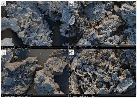 External morphology of (a) unmodified vermiculite filler, and vermiculite fillers modified with (b) casein, (c) chitosan, and (d) potato protein.