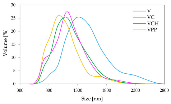The size of the vermiculite fillers’ particles was assessed by polyol dispersion (0.04 g L−1), using the dynamic light scattering method. The particle size distribution of the unmodified vermiculite filler (V) and the vermiculite fillers modified with casein (VC), chitosan (VCH), and potato protein (VPP) are presented in Figure 2. The results indicate that the size of the unmodified and modified vermiculite fillers ranged from 600 to 2600 nm. The highest percentage of particles was observed at ~960 nm for the vermiculite filler modified with casein, ~1100 nm for the vermiculite fillers modified with chitosan and potato protein, and ~1280 nm for the unmodified vermiculite filler.