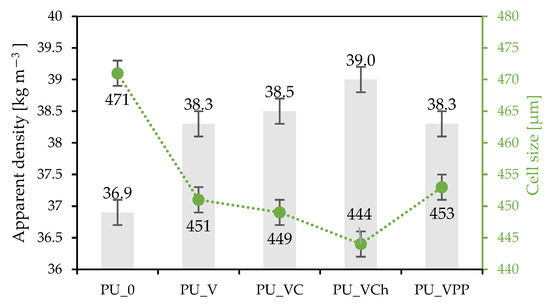As presented in Table 1, the incorporation of vermiculite fillers affected the dynamic viscosity. The increased dynamic viscosity slowed down the free growth of foam cells, which can be observed in the extended processing times, and as a result, also led to an increase in the apparent density of the synthesized composites. When compared with PU_0 (foam without filler addition), after the addition of vermiculite fillers, the dynamic viscosity increased by 8, 9, 14, and 19% respectively, for PU_VPP, PU_V, PU_VC, and PU_VCH. In terms of the characteristic processing times, the addition of vermiculite fillers caused an increase in creaming times of 12, 21, 26, and 33% and an increase in expansion times of 7, 12, 19, and 25% for PU_VPP, PU_V, PU_VC, and PU_VCH, respectively, when compared with PU_0. As presented in Table 1 and Figure 3, the apparent density values increased from 36.9 kg m−3 for PU_0 to 38.3 kg m−3 for PU_V and PU_VPP, 38.5 kg m−3 for PU_VC, and 39.0 kg m−3 for PU_VCH. The increase in the viscosity of the polyol mixtures resulted in a slowed expansion of the cells; therefore, the modified foams demonstrated slightly lower average cell sizes. When compared with the reference foam, PU_0, the average cell size decreased from 471 µm to 453 µm for PU_VPP, 451 µm for PU_V, 449 µm for PU_VC, and 444 µm for PU_VCH. However, the differences between the cell sizes of these foams were slight and were often within the error limit.