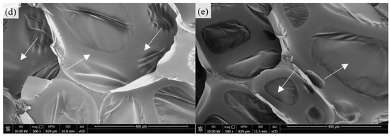 During the analysis, in the case of all the analyzed foams, most of the filler particles turned out to be embedded in the cell structure, which resulted in the improvement of the structure’s subsequent mechanical properties. Naturally, there were also filler particles inside the pores, but they constituted a definite minority. In the SEM images presented in Figure 4, the places of occurrence of the filler particles are highlighted by arrows.