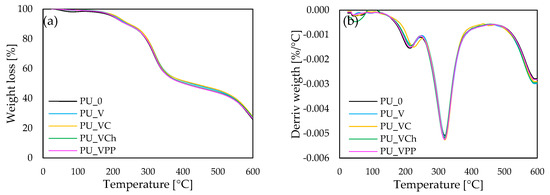By analyzing the influence of the fillers on the thermal stability of the obtained polyurethane composites, the char residue at the temperature of 600 °C was also measured. When comparing the amount of char residue with the PU_0 result, it can be observed that all the vermiculite fillers (unmodified and modified with casein/chitosan/potato protein) caused an increase in the amount of residue. The content of char residue increased from 26.1% for PU_0 to 26.7, 26.7, 27.5, and 28.0%, respectively, for PU_V, PU_VPP, PU_VCh, and PU_VC. Based on these results, it can be concluded that the application of vermiculite fillers can increase the thermal stability of polyurethane composites.