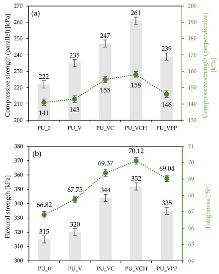 Figure 6b presents the results of the flexural strength and toughness analysis. In the case of flexural strength, the value of this parameter increased from 315 kPa for PU_0 to 320 kPa for PU_V, 335 kPa for PU_VPP, 344 kPa for PU_VC, and even 352 kPa for PU_VCH. Therefore, the flexural strength of the best foam (PU_VCH) was about 10% better than that of the reference foam. In the toughness analysis, an analogous strengthening of the synthesized composites was observed. When compared with PU_0, the value of toughness increased from 66.82 °Sh to 67.75, 69.04, 69.37, and 70.12 °Sh for PU_V, PU_VPP, PU_VC, and PU_VCH, respectively. Based on the results of the analyses of the mechanical properties, it can be concluded that the application of both the unmodified and the modified vermiculite fillers contributed to the improvement of the mechanical properties. The best results for all the analyzed parameters were recorded for the PU_VCH foam.