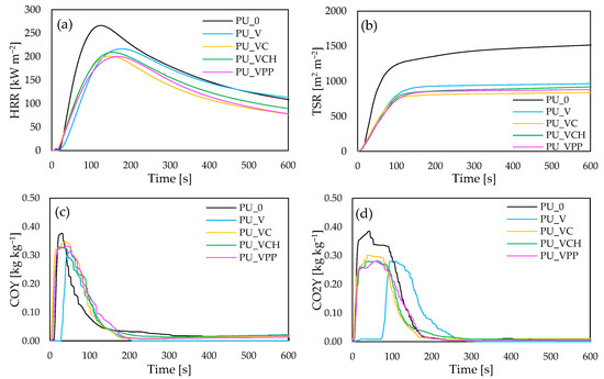 As presented in Table 4 and Figure 7c,d the incorporation of vermiculite fillers also reduced the average yield of CO and CO2. Compared with the reference foam, PU_0, the average yield of CO and CO2 decreased from 0.376 and 0.385 kg kg−1 for the reference foam to 0.347 and 0.301 kg kg−1 for PU_VC, 0.331 and 0.280 kg kg−1 for PU_VPP, 0.328 and 0.282 kg kg−1 for PU_VCH, and 0.317 and 0.281 kg kg−1 for PU_V. Regarding the limiting oxygen index (LOI), it can be observed that the values of this parameter increased from 20.1% for PU_0 to 21.1, 21.6, 22.5, and 22.8% for PU_V, PU_VCH, PU_VPP, and PU_VCH, respectively.