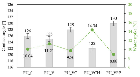 The hydrophobic nature of the analyzed foams was assessed using contact angle and water uptake analysis. Water absorption abilities of porous materials depend mainly on their structure (the content of open and closed cells) and their hydrophilic or hydrophobic character. Figure 8 shows the contact angle and water uptake results. When compared with PU_0 (10.04%), the water uptake of the foams increased for PU_V (11.21%) and PU_VCH (14.34%) while the values of the contact angles decreased from 126° for PU_0 to 125° for PU_V, and 122° for PU_VCH. In the case of the other foams, the water absorption decreased (to 9.70% for PU_VC and 8.88% for PU_VPP) while the contact angle values increased (to 128° for PU_VC and 130° for PU_VPP, respectively). This may be related to the fact that unmodified vermiculite and chitosan exhibit hydrophilic properties [55,56]. On the other hand, the remaining modifiers (casein and potato protein) contain many hydrophobic groups that can reduce the water absorption of the obtained composites [57,58]. Figure 9 presents the drops on the surface of the analyzed foams during the examination of the contact angles.