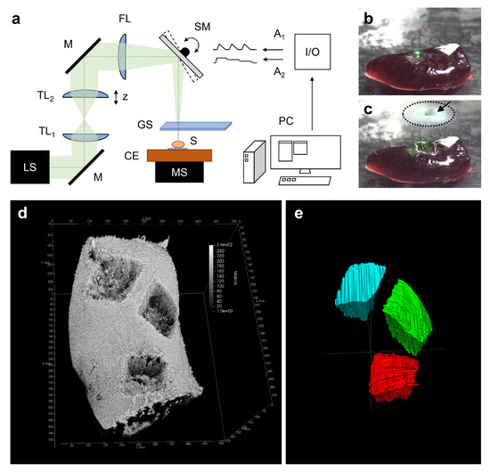(a) Schematic of the ablation setup. Green: divergent beam; LS: NIRL laser system; M: silver mirror; TL1, TL2: telescope lenses; FL: focusing lens (of 150 mm focal length); SM: two-axis scanning mirror; S: scanning of the sample; MS: manual stage; CE: cooling element (−15 °C); I/O: input/output card; A1, A2: analog control signals; PC: computer. GS: glass cover slip; (b,c) Photos of the tissue before and after irradiation; (c) Dashed ellipse: Condensed tissue aerosol. Arrow: indicating an area of lost condensate. Green light: pilot laser (532 nm wavelength); (d) Rendered 3D OCT image of the reference ablations on formalin-fixed murine spleen for ablation volume measurement purposes with the open-source application ParaView 5.9.1 [27]; (e) Manually segmented ablation volumes (with the labels red, blue, green) in the open-source software ITK-Snap 3.8.0 [28].