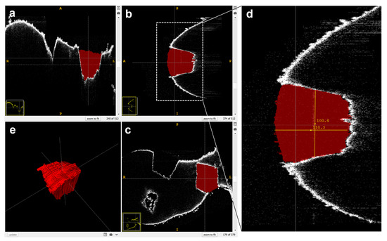 A formalin-fixed murine spleen was used as reference for ablation volume measurements to prevent sample deformation during the volume measurement procedure. The extracted volume was determined utilizing a spectral domain optical coherence tomography (OCT) system (OQ Labscope 2.0, Lumedica, Durham, NC, USA) with a central wavelength of 840 nm. The applied OCT imaging volume was 512 × 512 × 512 voxels with each voxel measuring 11.48 × 11.48 × 3.61 µm³ in air. The OCT image data (see Figure 1d) was manually segmented with the open-source segmentation software ITK-Snap 3.8.0 [28] (see Figure 1e). For each ablation, the voxel count and mean volume dimensions (width and depth) were determined (see Figure 2a–e). The values for all three volumes of the reference ablations, including the mean width and depth for each ablation site are listed in Table 1.