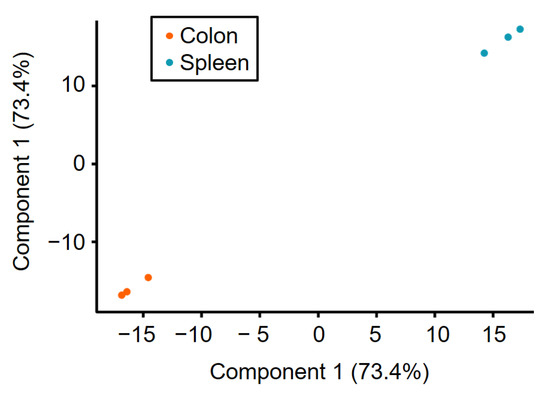 Differential quantitative proteome analysis of the murine colon tissue and the spleen tissue (three biological replicates from each tissue) sampled with NIRL resulted in 1889 identified proteins (see Supplementary Tables S1 and S2), where in a total of 501 proteins had quantitative data in all samples. In Figure 3, the results of a principal component analysis (PCA) (see Supplementary Table S3) are shown as scatter plot visualization, where component 1 (73.4%) is plotted against component 1 (73.4%). The PCA of the 501 proteins revealed a clear tissue-related distinction between colon and spleen samples based on component 1. Thus, the biological differences between the samples based on the different tissue types have the greatest influence. The biological replicates within a sample group play a subordinate role, as they show a low Euclidean distance in the scatter plot visualization of PCA, representing a high grade of similarity. This is also shown by the further results of the PCA, which show that only an explained variance of 14.7% could be calculated for component 2.