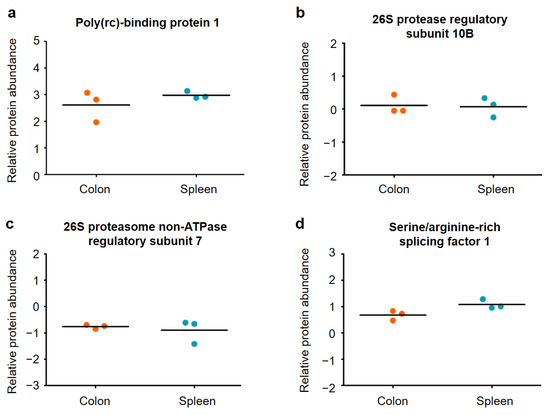 Relative protein abundance plots for (a) Poly(rC)-binding protein 1 (Pcbp1), (b) 26S protease regulatory subunit 10B (Psmc6), (c) 26S proteasome non-ATPase regulatory subunit 7 (Psmd7) and (d) Serine/arginine-rich splicing factor 1 (Srsf1) in murine colon and spleen samples. The data in (a–d) are highlighted in orange for colon tissue and in blue for spleen tissue.