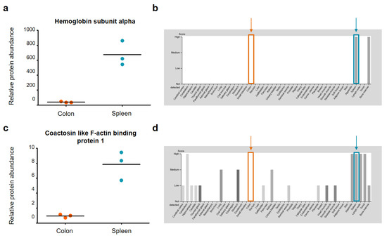 Relative protein abundance plots for (a) hemoglobin subunit alpha (Hba) and (c) coactosin like F-actin binding protein 1 (Cotl1) in murine colon and spleen samples. The corresponding protein abundance data of the Human Protein Atlas (HPA) [30] is shown in (b) for Hba and (d) for Cotl1. A total of 44 different tissue types were examined for the protein abundance data of the HPA. The data in (a,c) is highlighted in orange for colon tissue and in blue for spleen tissue. Images (b,d) are available from v20.1.proteinatlas.org.