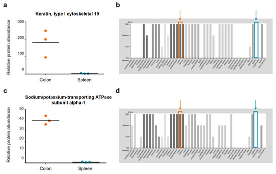 Relative protein abundance plots for (a) keratin, type I cytoskeletal 19 (Krt19) and (c) sodium/potassium-transporting ATPase subunit alpha-1 (Atp1a1) in murine colon and spleen samples. The corresponding protein abundance data of the Human Protein Atlas (HPA) [30] is shown in (b) for Hba and (d) for Cotl1. A total of 44 different tissue types were examined for the protein abundance data of the HPA. The data in (a–d) is highlighted in orange for colon tissue and in blue for spleen tissue. Images (b,d) are available from v20.1.proteinatlas.org.