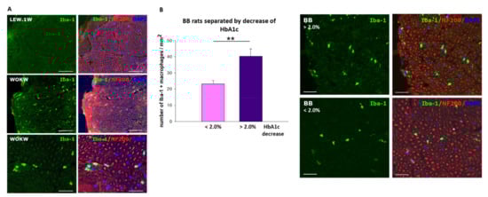 (A): Macrophages distribution in sciatic nerves of WOKW rats with metabolic syndrome and health LEW.1W control rats; [21]. Double immunofluorescence staining for Iba-1 (green, macrophages) and for neurofilament 200 (red). Nuclei are counterstained with DAPI (blue). Bar represents 100 µm and 50 µm (lower panel). (B): Macrophage distribution in sciatic nerves of BB/OKL rats stratified by the reduction in HbA1c values at the end of month 3 of insulin application [22]. Diagram: Quantification of Iba-1 (ionized calcium binding adaptor molecule 1)—positive macrophages. Photomicrograph: Double IF staining for Iba-1 (green, macrophages) and for neurofilament 200 (red). Note that the greater number of macrophages in sciatic nerve correlated with a larger reduction in HbA1c values (>2 per cent steps) as compared with the lesser reduction in HbA1c values (<2 per cent steps). Data from n = 7 are presented as mean ± SEM. ** p ≤ 0.01 according to the one-way analysis of variance together with the Newman–Keuls test. Bar represents 50 µm.