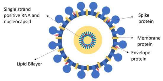 Coronaviruses (CoVs) are a group of RNA viruses belonging to the subfamily Orthocoronaviridae that cause disease in a variety of domestic and wild animals (e.g. porcine, bovine, feline and avian, and bat and whale strains) [5]. A defining characteristic in all CoVs is the crown-like viral particle, from which their name is derived [6,7]. It consists of three major structural proteins (spike, membrane, and envelope), that protrude from the viral envelope and have a critical function in cell recognition and fusion [6]. Additionally, the nucleocapsid (protein N) binds and stabilizes the viral genome (Figure 1) [8].