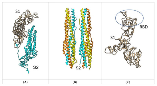(A) Single chain in trimeric spike protein with subunit S1 (Tan) and S2 (Cyan) in 7A94. (B) Post-fusion conformation of all S2 units in the trimeric spike in 6LXT. (C) S1 subunit, with the RBD highlighted in 7A94 [29].