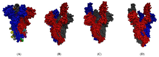 Spike protein conformations, with each spike monomer is represented by a colour (blue, red, gray). (A) All RBD down (PBD 6VVX) (B) 1 RBD up (PDB 7A94) (C) 2 RBD up (PDB 7A97) (D) All RBD up (PDB 7A98) [33].