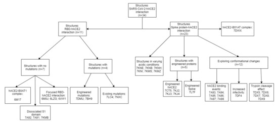 Organizational scheme of all structures found in this review. Molecular graphics analyses were performed with UCSF Chimera and Visual molecular dynamics [29,33]. A homology model for the S protein of SARS-CoV-2 Delta variant was created using SWISS-MODEL [37].