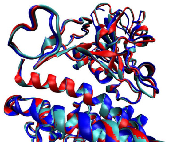 Alignment and superposition of the models representing the interaction with no mutations (PDB 6VW1/6M0J/6LZG) [33].