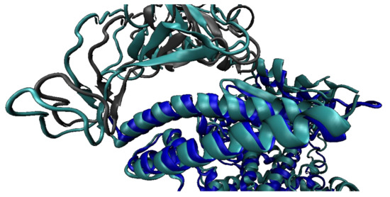 Superimposition and alignment of wild-type RBD and hACE2 (PDB 6LZG) (light blue) and mutated RBD (PDB 7BH9) (hACE2—dark blue ribbon/SARS-CoV-2 S protein—grey ribbon). The closer distance between the chains from the initial to the optimized model reflects the additional interactions established [33].