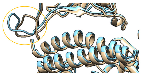 Structural superimposition between the wild-type RBD (Tan) (PDB 6M0J) and with the G485R RBD mutation (Cyan) (PDB 7LO4), with conformational change in the highlighted loop. The RMSD between structures is 0.42Å [29].