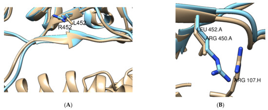 Mutation L452R, with the original variant from wild-type RBD (PDB 6M0J) (cyan) and the homology model of Delta variant (tan), obtained from genome MZ377116.1 (A) Superimposition of RBDs from original variant and Delta variant. Steric hindrance observed with Arg107 from Ab from structure 7CM4, due to a longer side chain in Delta variant (B) RBDs of original and delta variant structures with no steric hindrance regarding hACE2 [29].