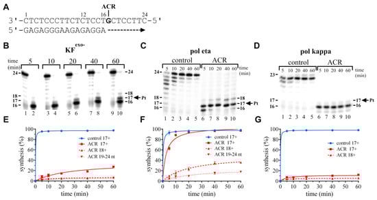 - Miller, H.; Grollman, A.P. Kinetics of DNA polymerase I (Klenow fragment exo-) activity on damaged DNA templates: Effect of proximal and distal template damage on DNA synthesis. Biochemistry 1997, 36, 15336–15342. [Google Scholar] [CrossRef]