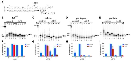2.2.3. Nucleotide Misinsertion Opposite the ACR Adduct by KFexo− and Human Polymerases Eta, Kappa, or Iota