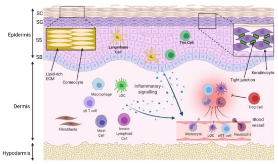The functions of the immune barrier are predominantly carried out by specialised immune cells in the skin (Figure 1). The most superficial immune cells are Langerhans cells (LCs), a subtype of dendritic cells (DCs), which reside in the epidermis and have antigen-presenting functions [5]. Other DC subtypes are found in the dermis. Conventional (c)DCs are present in the steady state and also infiltrate during inflammation, whereas plasmacytoid (p)DCs are rarely found in healthy skin, and only migrate into the dermis after receiving inflammatory signals [6]. Neutrophils, monocytes and T cells, additionally, migrate into the dermis following inflammatory signalling [7]. In the steady state, skin T cells are largely resident memory T cells (TRM), which include epidermal TRM CD8+ cells and dermal TRM CD4+ cells [8]. Other skin resident immune cells include innate lymphoid cells (ILCs), mast cells, and γδ T cells [8], which are crucial in initiating inflammatory cytokine responses. Traditional CD4+ regulatory T cells and the newly studied tissue resident memory regulatory T cells also both localise in the skin and resolve immune responses [9]. Keratinocytes, additionally, facilitate the immune barrier by releasing antimicrobial molecules (notably, β-defensins and cathelicidins) and cytokines that activate dermal leucocytes [7].