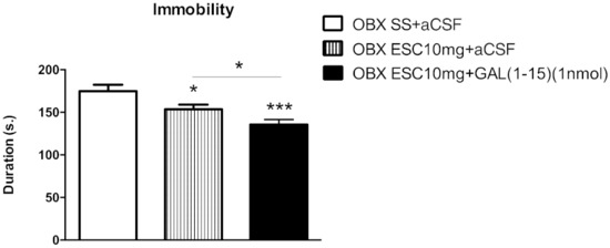 In our study, ESC induced a reduction in immobility in the TST in OBX animals. This result agrees with previous ESC acute studies in rodents using several ESC doses [36]. However, in this work, ESC lacked an effect in FST. Although this is the first study describing the impact of ESC in OBX animals in the FST, in naïve rats, ESC at 10 mg shows the variability of response: no effect or a decrease in the FST [37,38]; This variability has been explained by the different pattern of ESC used. Since in this work we have used a subchronic injection pattern, we will need to address the effect of GAL(1-15) in chronically administered ESC in OBX rats in future experiments.