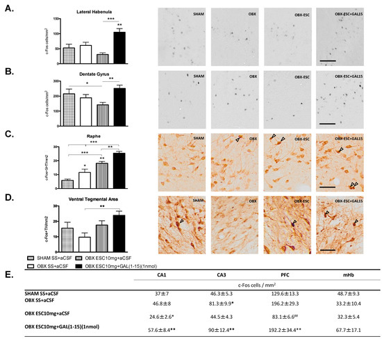 Effects of ESC10 mg and GAL(1-15) (1 nmol) alone or in combination on c-Fos expression. Data represent mean ± SEM of c-Fos cells/mm2 in dorsal hippocampus (dentate gyrus (DG), CA1, CA3), prefrontal cortex (PFC), lateral habenula (LHb), and medial habenula (mHb). The mean ± SEM of c-Fos/5HT in the dorsal raphe (DR) and c-Fos/TH cells/mm2 in the ventral tegmental area (VTA) is also shown. One way ANOVA followed by Fisher multiple comparison test (n = 3–5 in each group). In subfigures (A–D), a representative photomicrograph illustrating the different treatments are also shown. Scale bar = 100 μm. In (A) ** p < 0.01 versus OBX SS+aCSF and SHAM SS+aCSF and *** p < 0.001 versus OBX ESC10 mg/kg+aCSF. In (B) * p < 0.05 SHAM SS+aCSF versus OBX ESC10 mg/kg+aCSF and ** p < 0.01 versus OBX ESC10 mmg/kg+aCSF; In (C) * p < 0.05 versus SHAM SS+aCSF and ** p < 0.01 versus OBX SS+aCSF; In (D) ** p < 0.01 versus OBX SS+aCSF; In (E): In CA1, * p < 0.05 versus OBX SS+aCSF and ** p < 0.01 versus OBX ESC10 mg/kg+aCSF. In CA3, * p < 0.05 versus OBX ESC10 mg/kg+aCSF and SHAM SS+aCSF, and ** p < 0.01 versus OBX ESC10 mg/kg+aCSF and SHAM SS+aCSF. In PFC ** p < 0.01 versus OBX ESC10 mg/kg+aCSF and ## p < 0.01 versus OBX SS+aCSF.