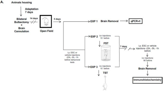 After the accommodation period, animals underwent either olfactory bulbectomy (OBX) or sham surgery. The OBX procedure and the stereotaxically implanted guide cannula has been described previously [26] (Supplementary Materials). On day 14 post-surgery, we confirmed the validity for the lesions by assessing increased activity in the open field. A pictogram of the entire protocol is represented in Figure 6.
