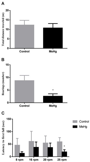 Effects of methylmercury (MeHg) in motor performance. Total distance walked (A) and number of rearings (B) registered in the open field test, and latency time to the first fall in the rotarod test (C) were analyzed in rats orally exposed to water (Control) or MeHg 5 mg/kg (MeHg) for four consecutive days. Behavioral tests were performed 24 h after the last dose of treatment. Results are expressed as mean ± SEM. n = 4–5 per group. Student t test, * p < 0.05 vs. control.