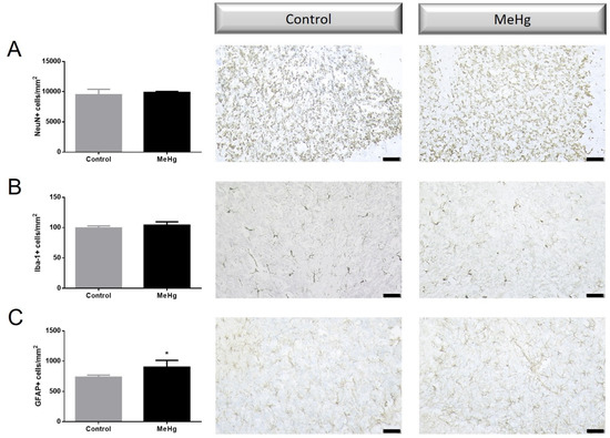 In fact, MeHg treatment appeared to induce a small but significant increase in the number of GFAP+ cells (Figure 2C) but no change in NeuN+ or IbaI+ cells (Figure 2A,B), suggesting astroglial reactivity.