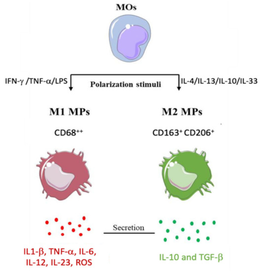 Macrophages can polarize toward two different phenotypes based on acting stimuli (Figure 3): pro-inflammatory (M1-MPs) and anti-inflammatory (M2-MPs) cells. T helper (Th)1-related cytokines, such as IFN-γ and TNF-α, or lipopolysaccharide (LPS), induce M1-MP differentiation, while Th2 cytokines (e.g., IL-4 and IL-13) or IL-10 and IL-33 switch macrophage differentiation toward the M2-MP phenotype [50,51]. M1-MPs express CD68 at a high level that mediates the activation of phagocytosis and pro-inflammatory cytokine secretion; conversely, M2-MPs, positive for CD163 and CD206 and negative for CD68, promote anti-inflammatory cytokine release [51].
